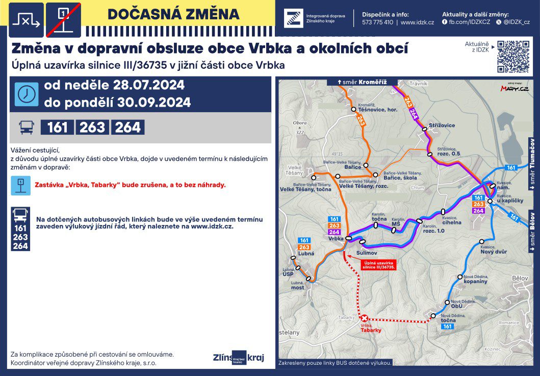 ZÁMĚNA VÝSTAVBY ETAP silnice Vrbka – ÚPLNÁ UZÁVĚRA III.ETAOY – od neděle 28.7. do 30.9. bude neprůjezdná silnice směr Nová Dědina. Směr Kroměříž a Kvasice bez omezení.