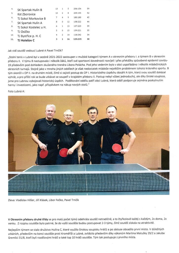 V neděli 20. března 2022 se uskutečnil na kulturním domě v Lubné 4. bodovací turnaj začínající mládeže okresu Kroměříž, kterého se zúčastnilo 24 žáků a žaček. Turnaj se hrál švýcarským způsobem na 8 kol s následujícím výsledkem: