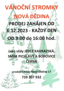 Manželé Ševčíkovi oznamují že prodávají vánoční jedličky. Prodej se uskuteční v sobotu 16.12.2023 na poli pod kravínem od 10.00 do 15.00 hodin.