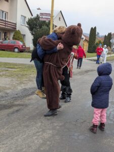 „Kolik nás letos bylo? V největší síle jsme napočítali krásných 43 masek! Průvod zaplnily nápadité a veselé kostýmy v čele s naším medvědem, který byl po dlouhé zimě evidentně pořádně hladový, a o to víc neúnavný. O smích a dobrou náladu tak rozhodně nebyla nouze . Po celou dobu panovala skvělá atmosféra a radost ze společného setkání. I když nám ke konci počasí už tolik nepřálo, nic nás nezastavilo a všichni jsme společně dorazili až do cíle.