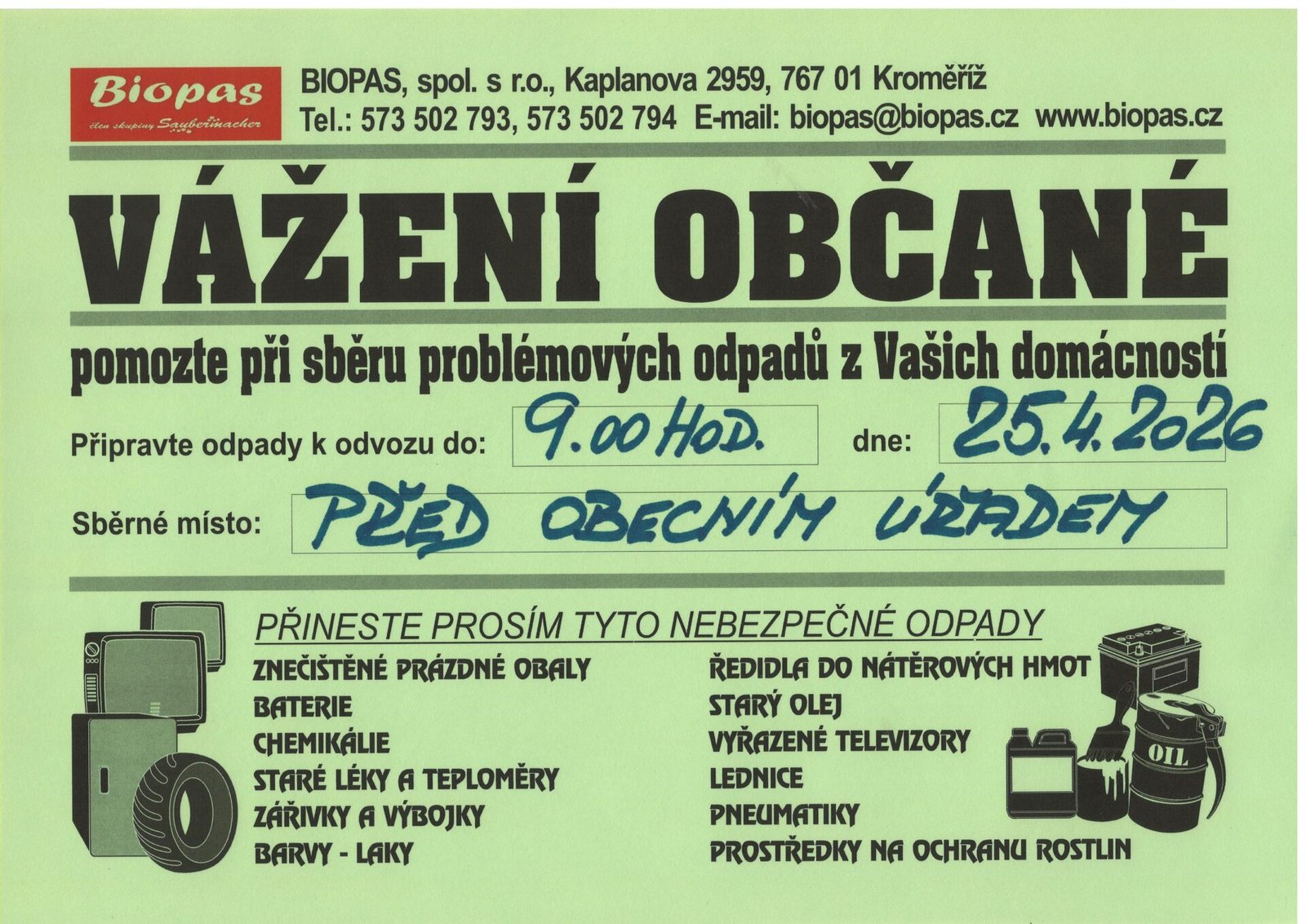 Sběr nebezpečného odpadu 25.4.2026 v 9,00