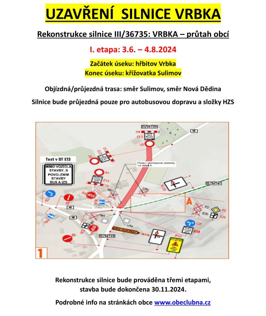 Od pondělí 3.6. do 4.8.2024 dojde v důsledku opravy silnice na VRBCE k uzavření úseku OD ZAČÁTKU OBCE OD HŘBITOVA AŽ PO KŘIŽOVATKU DO SULIMOVA. Trasa z Lubné přes Sulimov či směr Nová Dědina při výstavbě této – I. etapy – je průjezdná. O další etapě budete včas informování.