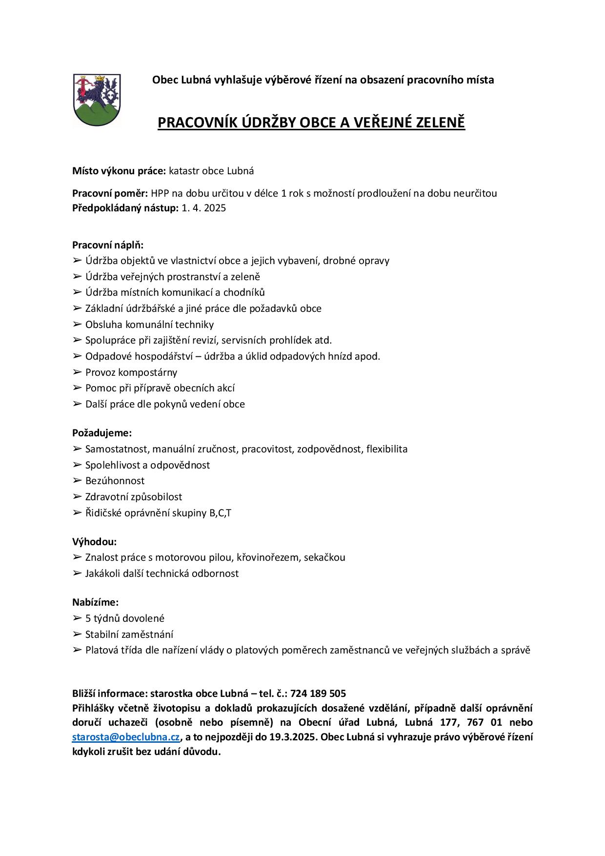 VÝBĚROVÉ ŘÍZENÍ – PRACOVNÍK ÚDRŽBY OBCE A VEŘEJNÉ ZELENĚ Obec Lubná / Aktuality / Výběrové řízení – pracovník obce